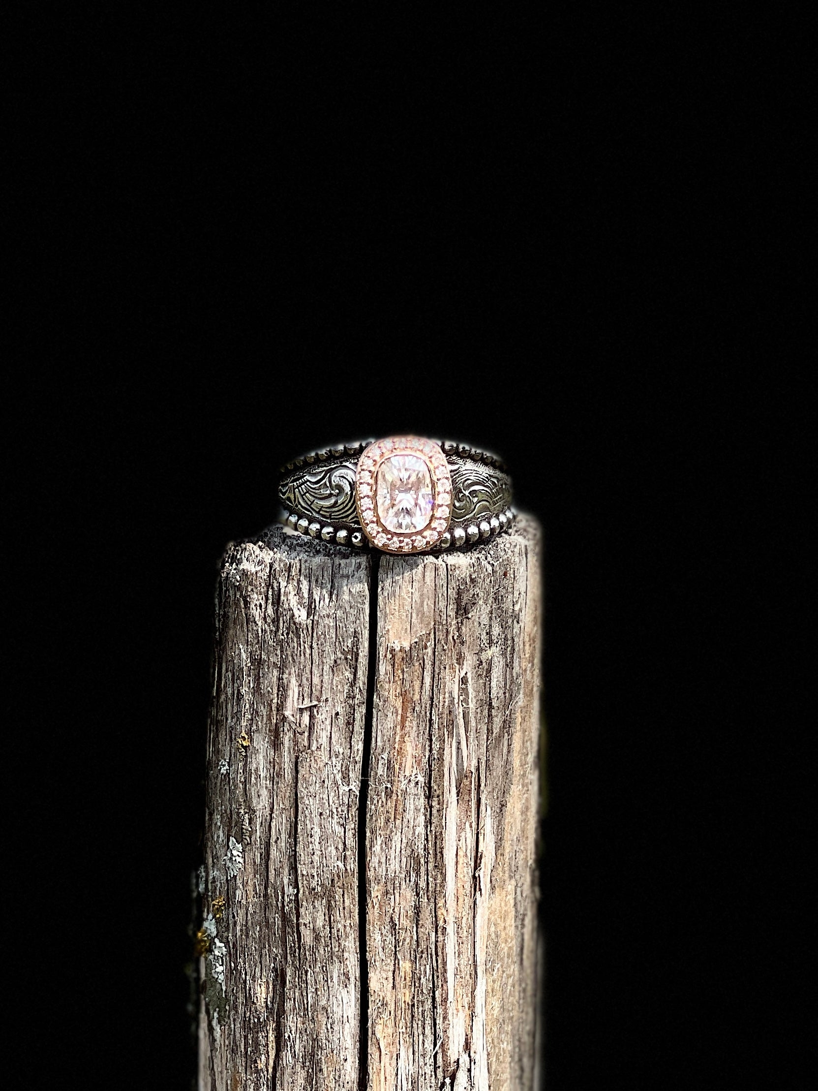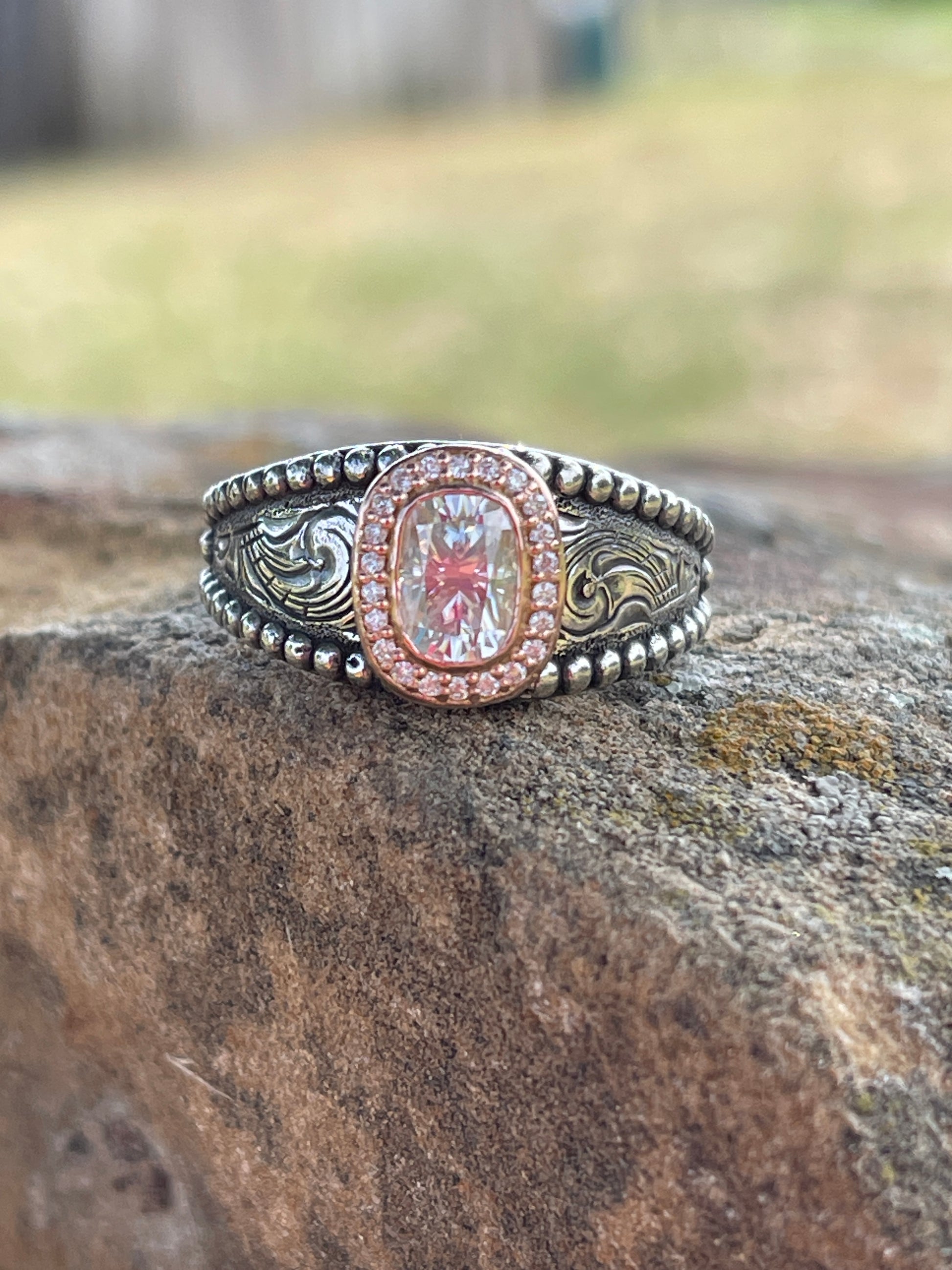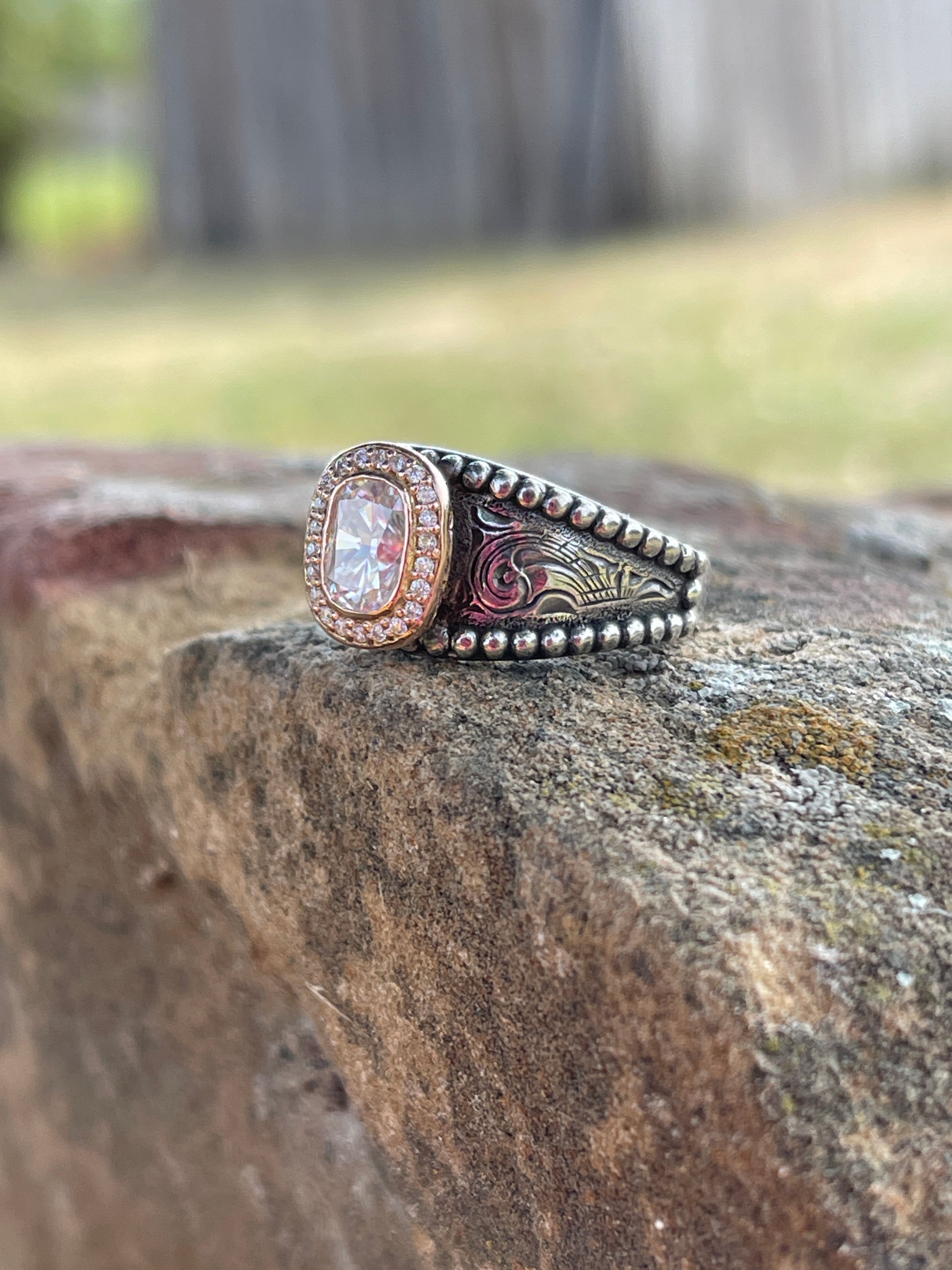 Experience classic elegance with this stunning classic design. Crafted from solid sterling silver custom engraved band. Topped with a rose gold halo of 22 lab grown diamonds surrounding a 1 carat lab grown antique oval diamond. This is a timeless design and shimmering beauty, this is the perfect ring that will last a lifetime.