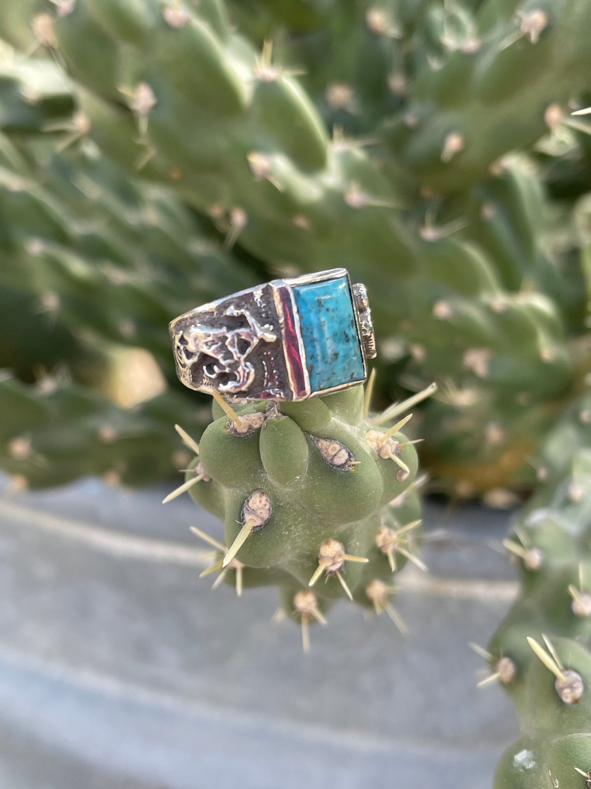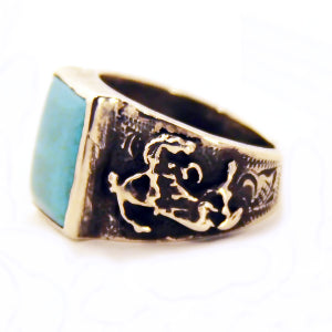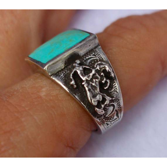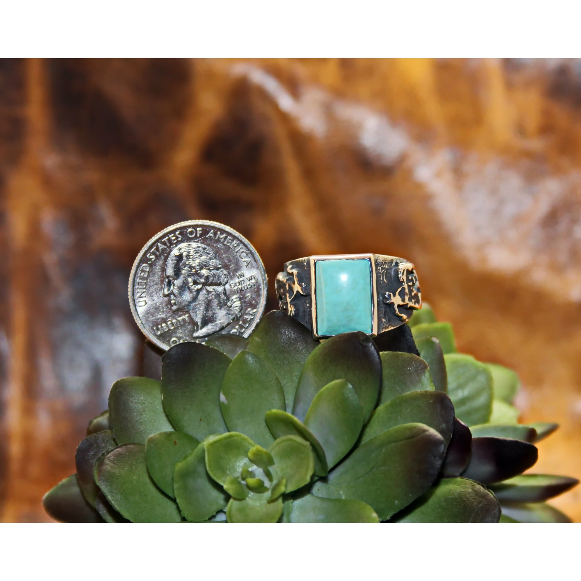 "Roy" is a sterling silver ring that features a 10mm x 14mm bezel set genuine Kingman turquoise stone from the Kingman Mines in Kingman, AZ. Both side of the ring features western style hand engraved scrolling with an overlaid bucking horse symbolizing the true west and a true cowboy.
