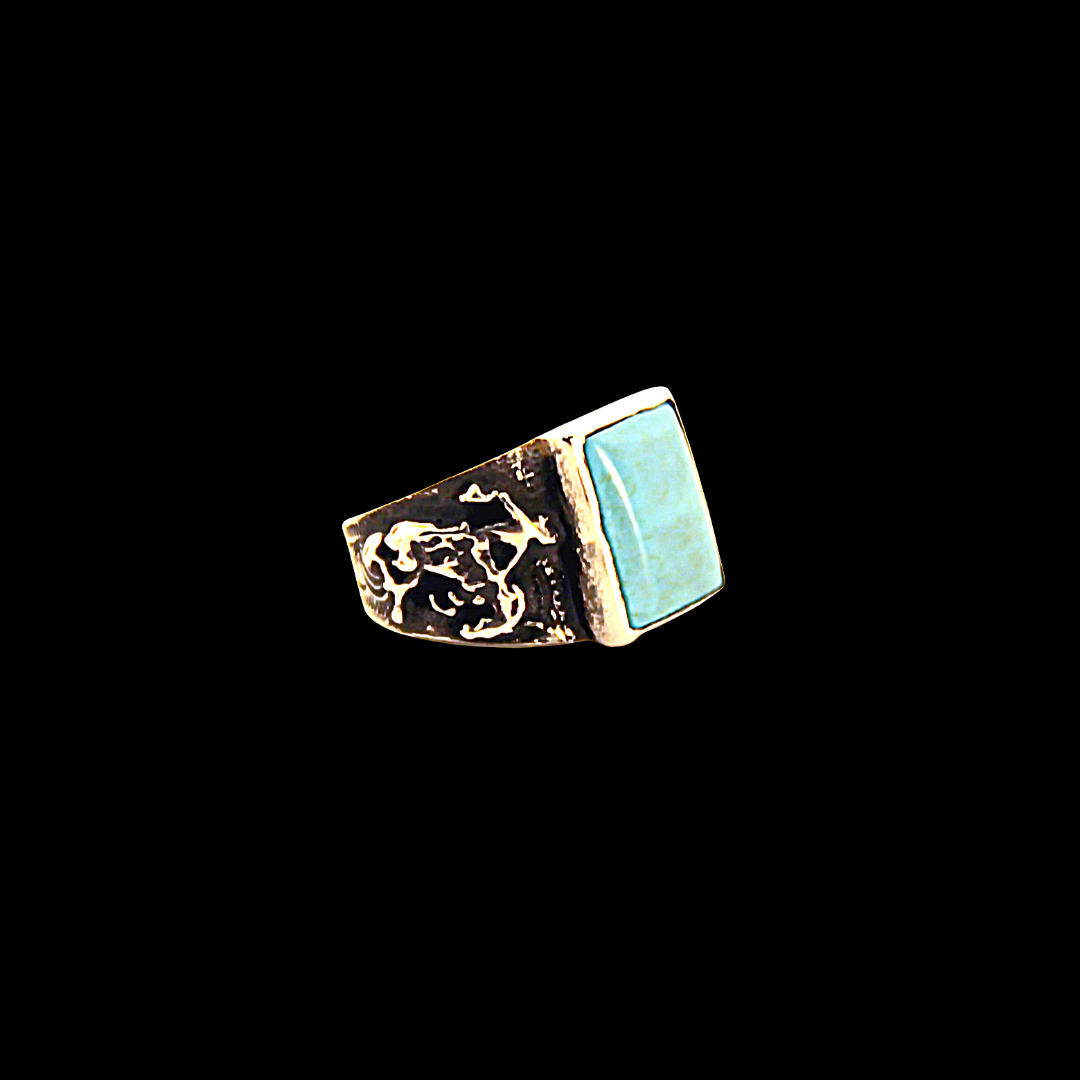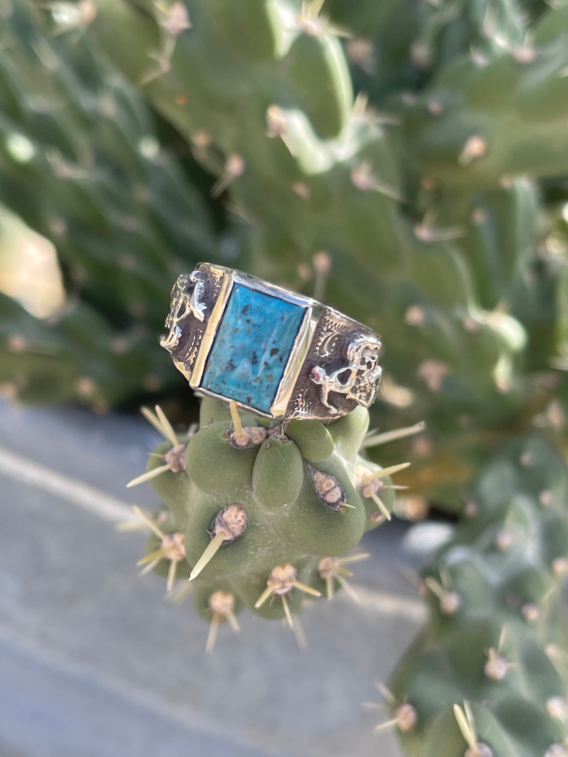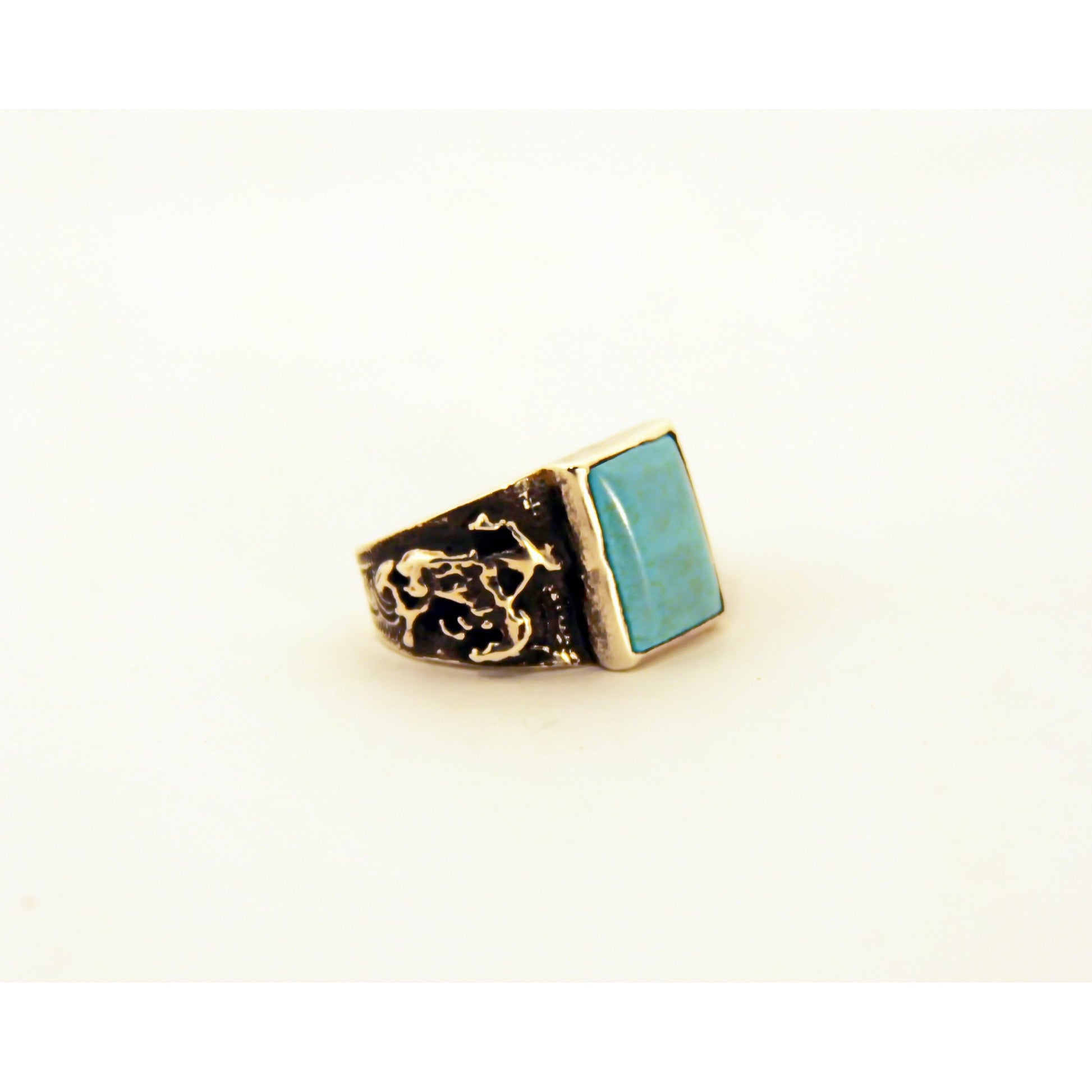 "Roy" is a sterling silver ring that features a 10mm x 14mm bezel set genuine Kingman turquoise stone from the Kingman Mines in Kingman, AZ. Both side of the ring features western style hand engraved scrolling with an overlaid bucking horse symbolizing the true west and a true cowboy.