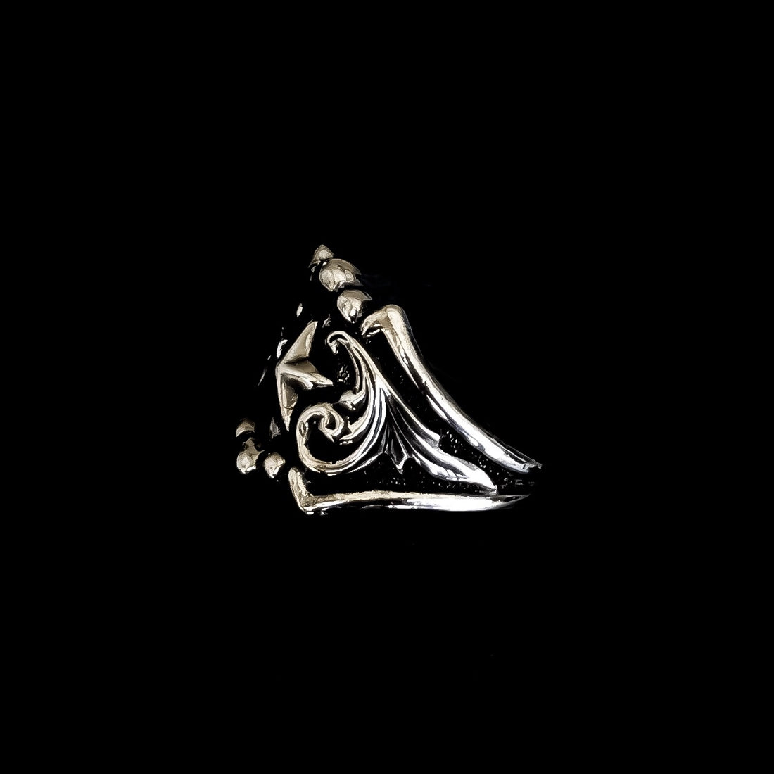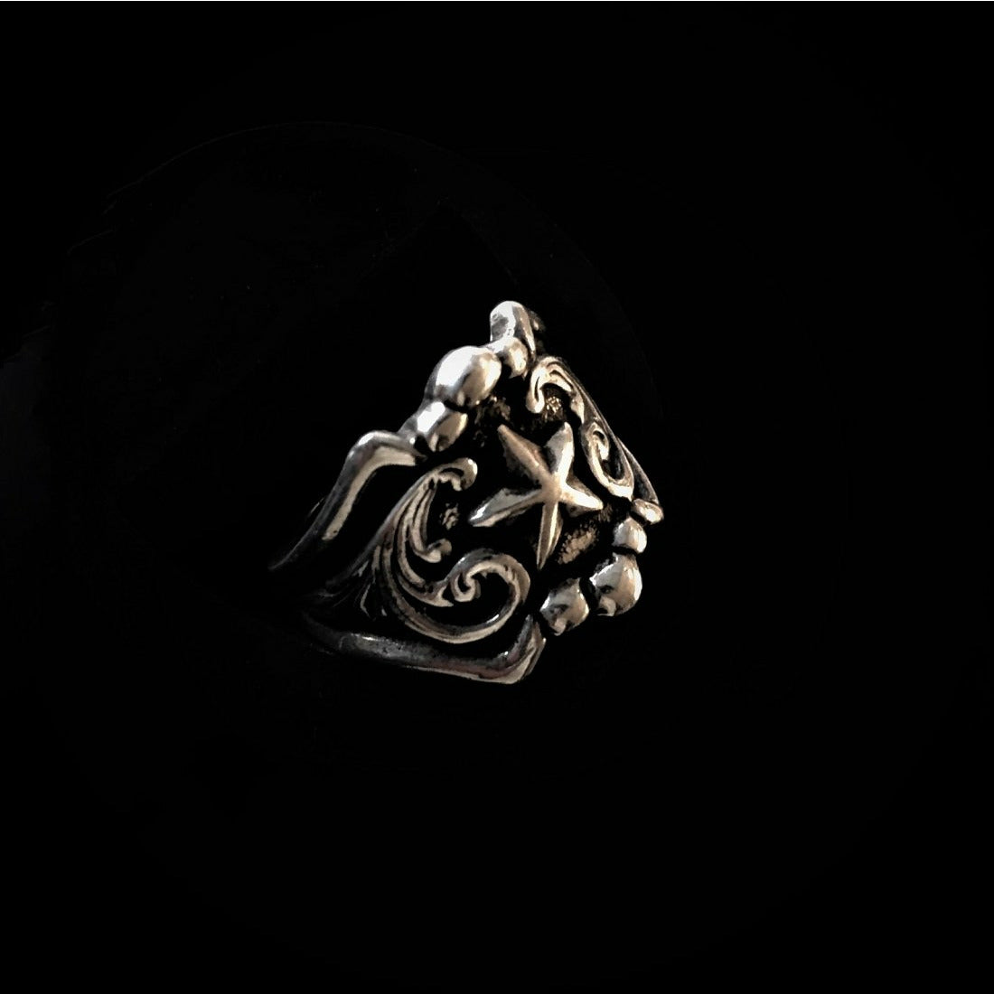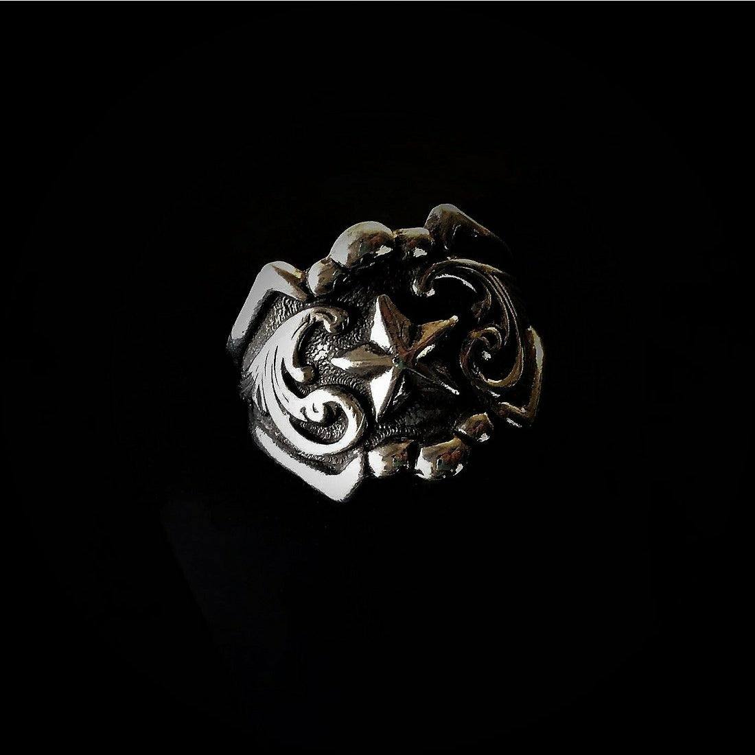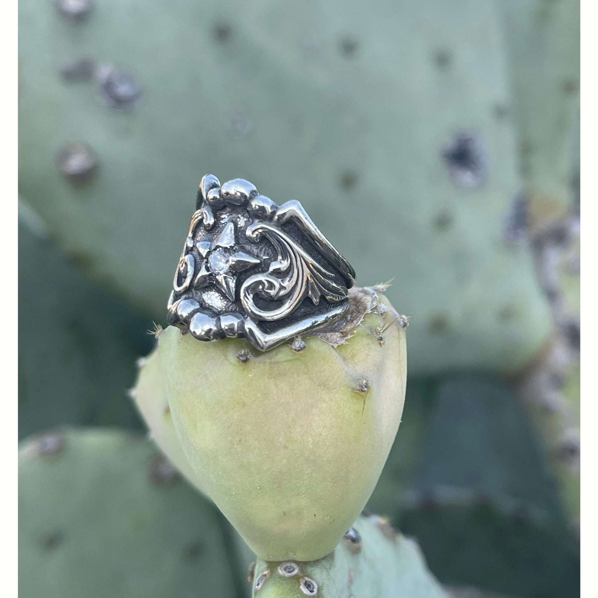 "Texas Star" is a solid sterling silver ring that has a unique border featuring an overlaid star in the setting and overlaid western style engraved scrolling on either side of the tapered band.