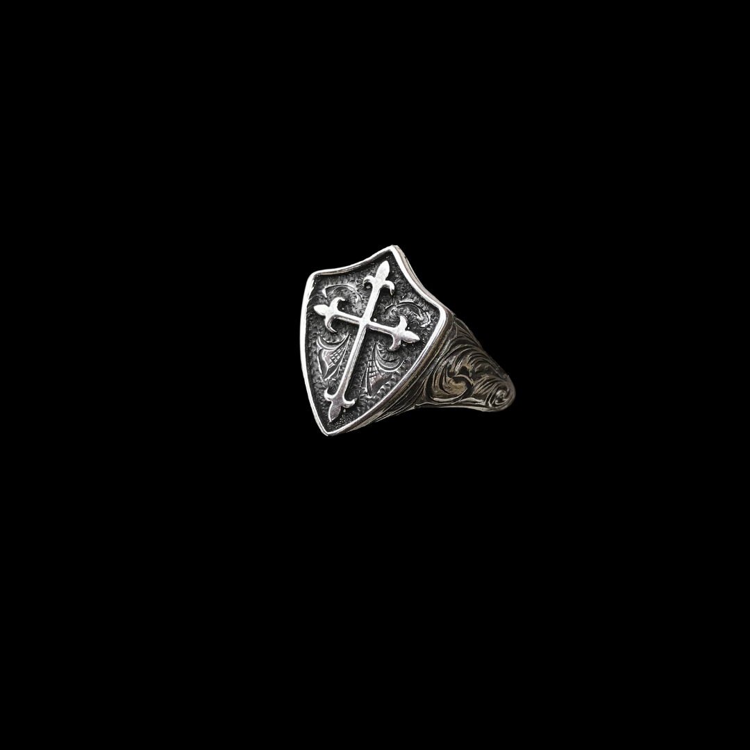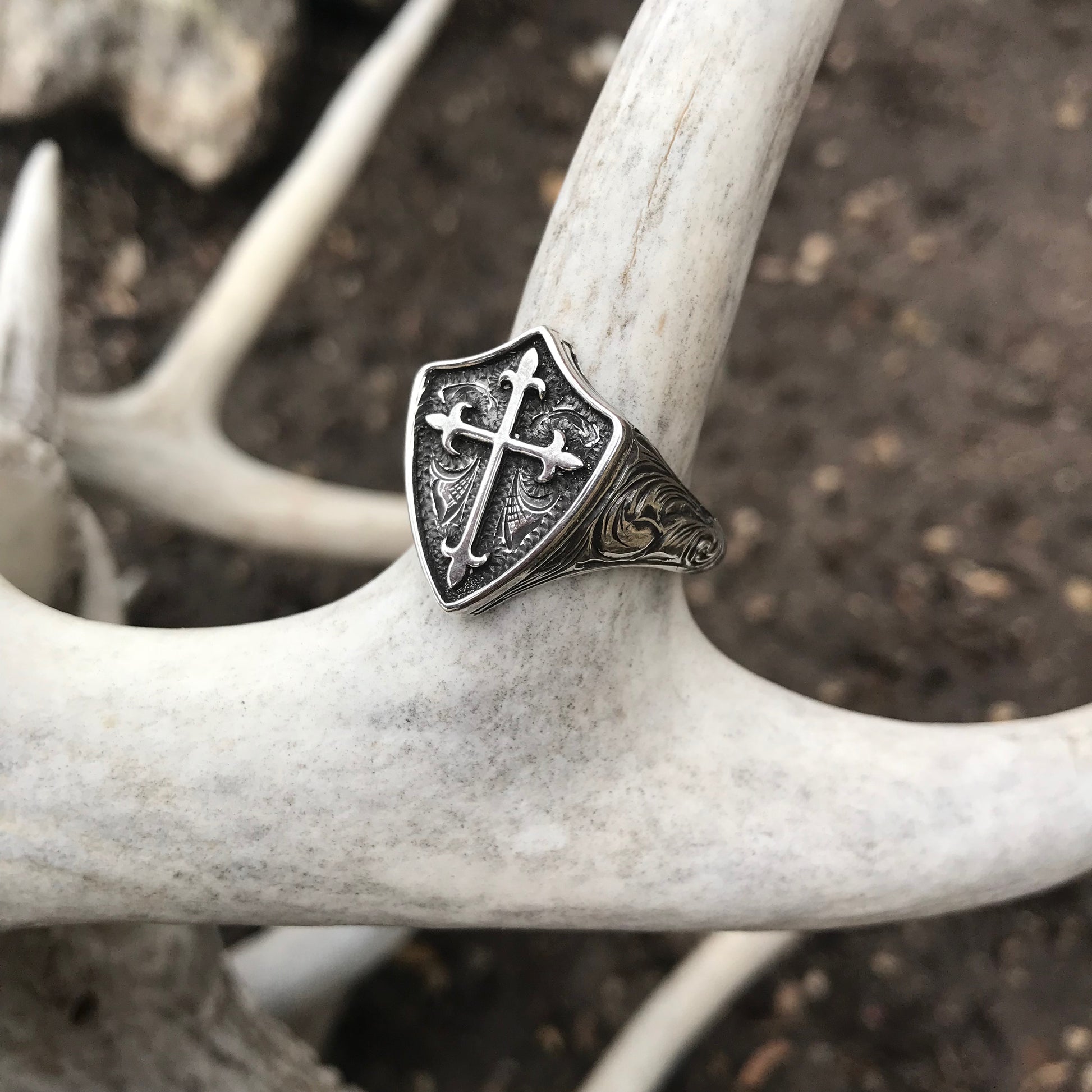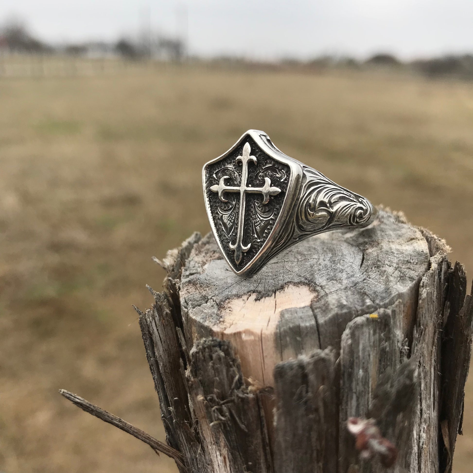 Rockin Out Jewelry's "Protector Ring" is a men's sterling silver ring that features a shield and showcases a cross in the middle with engraving in the background. There is also western scroll work done on both sides of the band. The shield measures 21.5mm x 15.5mm and the band starts at 8.6mm and tapers down to 3.8mm for a nice and comfortable fit.